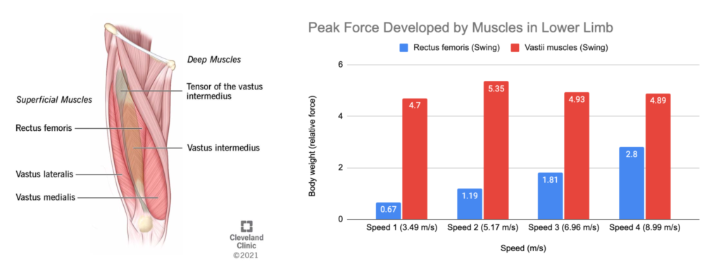 The quadricep muscles tend to have a lot of loading through all speeds of running but there is a clear increase in rectus femoris muscle demands with increasing running speed. This also makes sense as the rectus femoris muscle crosses both the hip and knee.