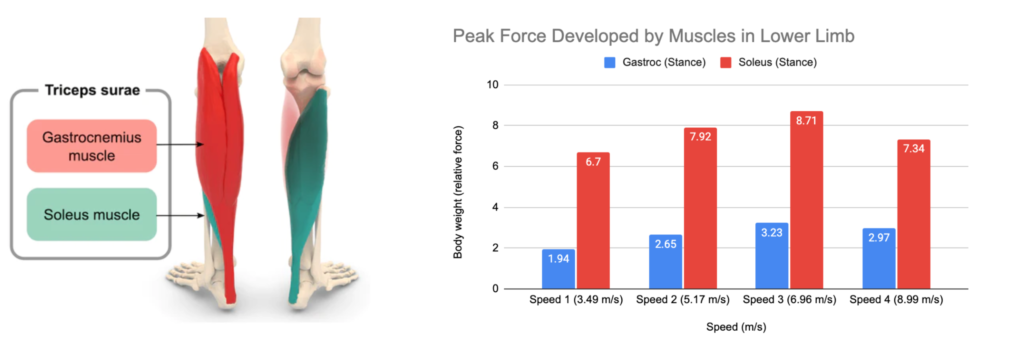 Finally, the last graph demonstrates the high loads through the calf complex as running speed increases and more importantly it puts a spotlight on the soleus muscle. The soleus muscle is typically not known to the general public and is under-appreciated in strength training. It is a powerful flat muscle that sits underneath the gastrocnemius muscles and generates more than 3 times the amount of force compared to the gastrocnemius muscles. The soleus muscle is more targeted with bent knee calf exercises and is crucial to power generation in all speeds of running.